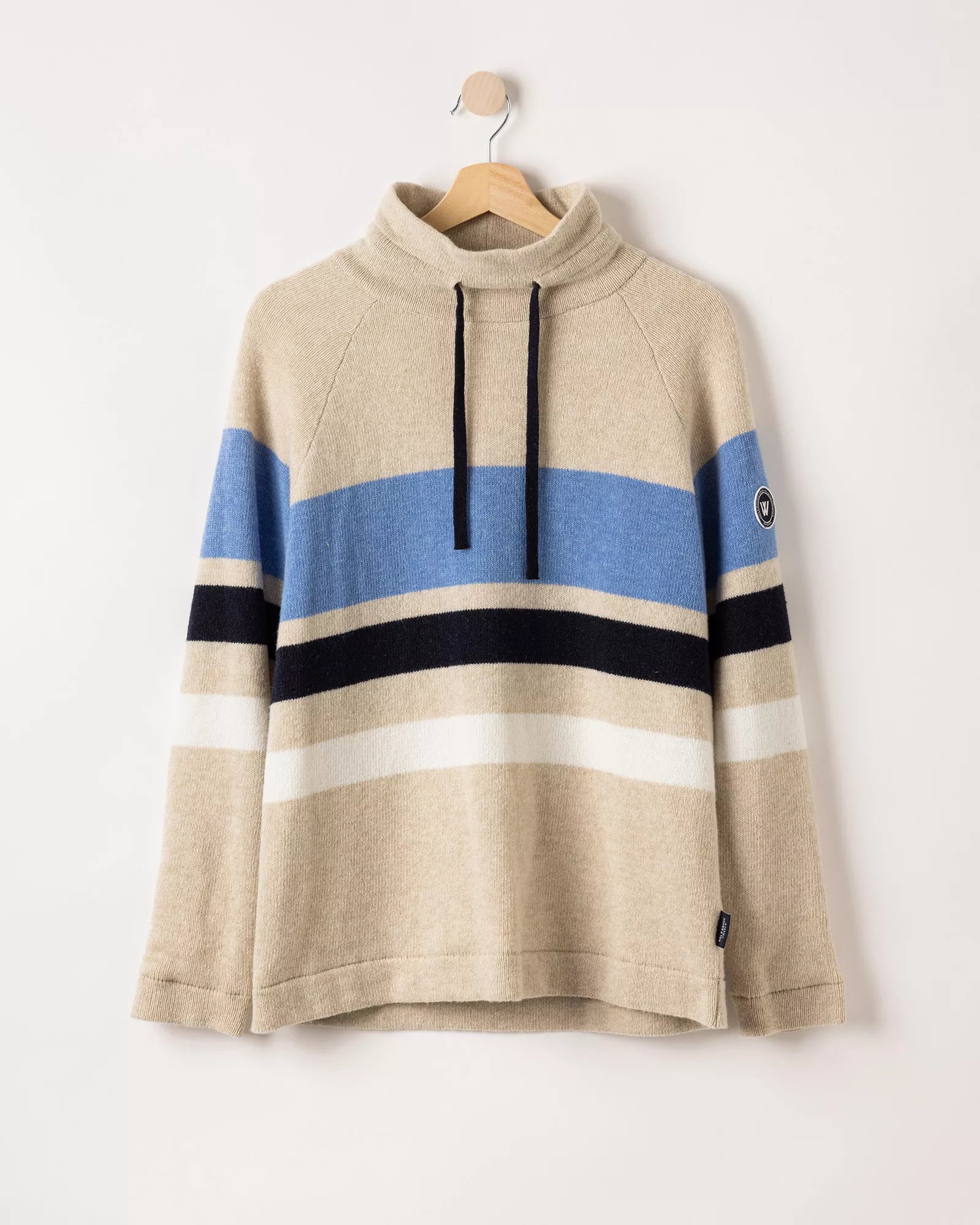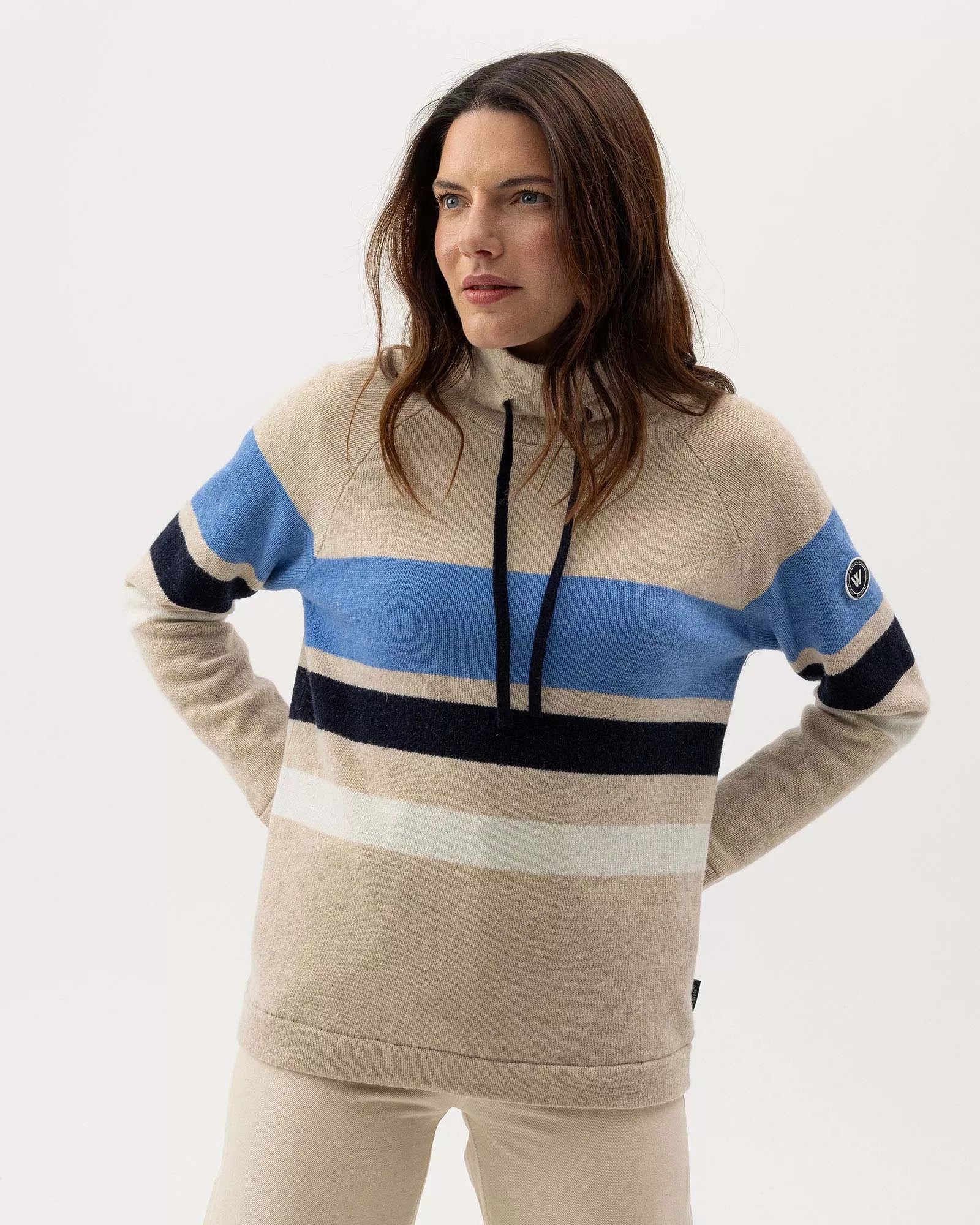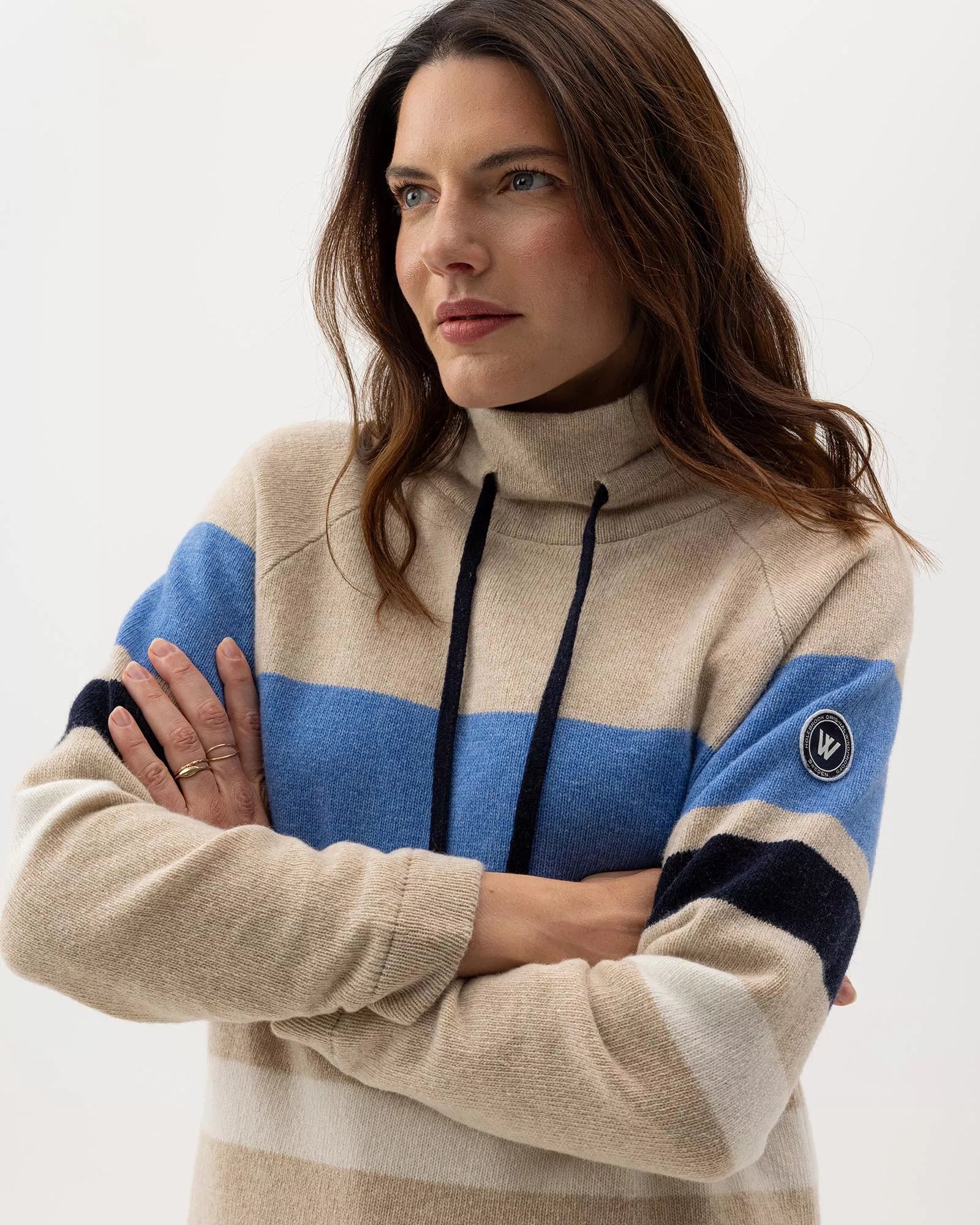 Wind-lined knitted sweater in a soft wool blend. High collar with practical drawstring. Raglan sleeves and regular fit. The sweater has a windproof elastic lining consisting of 96% polyester and 4% elastane. No chemicals are used to achieve the windproof function. Instead, the lining is manufactured with a special weaving technique that makes the fabric extremely tightly woven and therefore also windproof, while the fabric is breathable. The elastane makes the fabric stretchy, which means that it stops the wind but not movement. The fabric is marked with ÖKO-tex® Standard 100, which guarantees that the fabric is free from harmful substances. Sustainably produced in Europe.